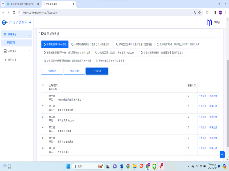 在【校園方案】中為了讓老師了解或掌握學生觀課情形,老師可登入門拓”老師專區”查看學生觀課情形:
