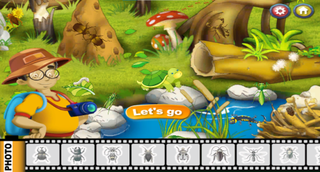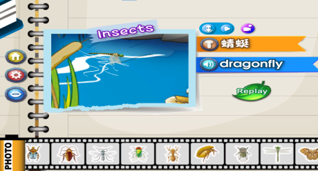 Insect Photos為三十二種昆蟲爬蟲類的雙語聲控互動學習APP,使用Unity、互動動畫,結合AI智能、聲控技術、語音辨識系統製作。沉浸式場景教學將多種昆蟲爬蟲類放入郊外池塘,讓孩子觀察找出並分類,全對了就能通關遊戲,不僅學習英文更練習了孩子的觀察能力和反應速度。將科學知識融入遊戲,並透過觀察推理寓教於樂,實現玩中學、學中玩的理想教育。
