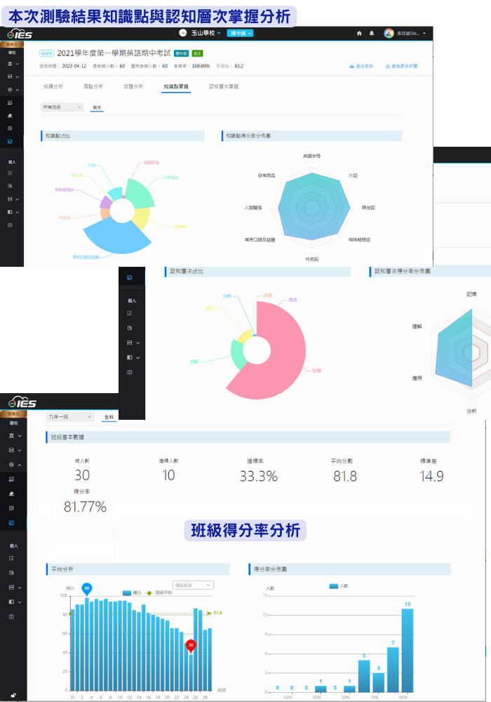 一份考卷通常不會只考一個觀念。知識點分析,一方面讓老師掌握這份考卷實際測驗內容,看出分數背後的實質學習意義。知識點占比以圓餅圖、雷達圖呈現,清楚呈現出各知識點在該試卷中的比重。