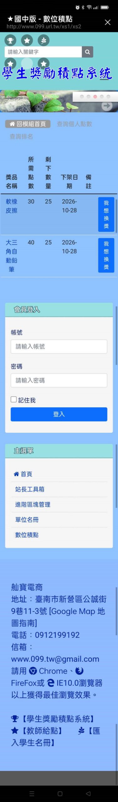 ■功能規格:伺服主機硬碟規格:快速讀寫SSD,CPU/記憶體:1.5G/1.5G,伺服器資訊:作業系統 Linux,Apache 版本 2.4.56,PHP 版本 7.4.33,MySQL 版本 8.0.32-cll-lve。Linux作業系統上架設XOOPS,具備個別登入的認證功能,有權限的使用者可以通過手機、平板電腦或電腦操作國中版學生獎勵積點系統。