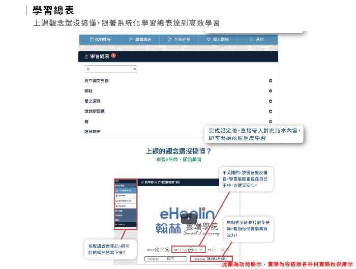 1. 產品功能:名師課程 24H 在家反覆觀看,搭配學校進度彈性安排時間,講義、影音完全對照使用,根據個人吸收程度調整速度,邊上課邊寫筆記。