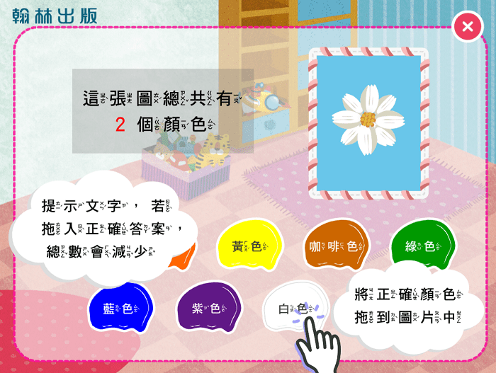 搭配生活教材設計的色彩互動教學遊戲,提前給予學生基本的色彩概念,更透過生活中實際的物品或是看到的植物和花,引導學生進行顏色的分辨。搭配教材課程內容引導,強化學習單元知識重點,快速了解教學內容。