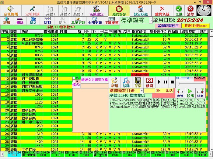 語音教材資料庫管理、點對點信息互通 具自動化預約定點定時音樂鐘聲及音樂檔案播放之功能 。可透過校園網路上傳英聽影音數位檔案全校播送。能夠抓取音樂資料庫裏任意音樂檔案自動編列,做預約排程,播放時間長短可設定調整。支援微軟文字轉語音功能。