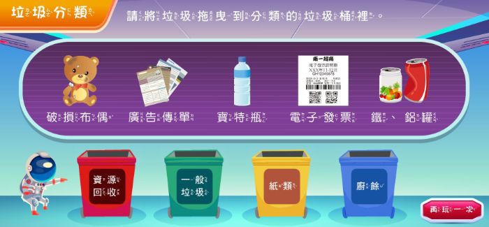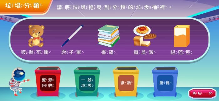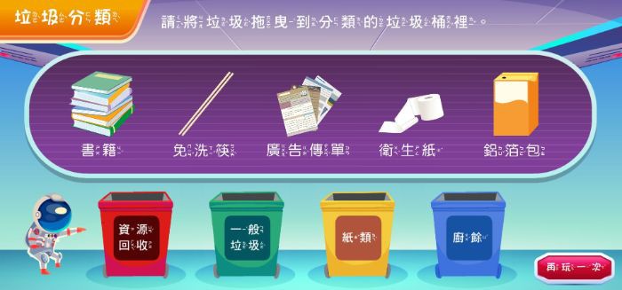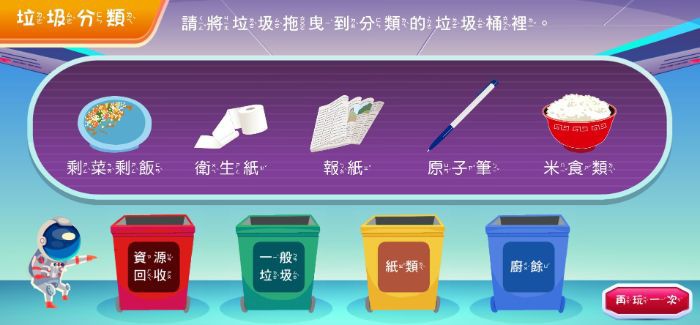 1.內容說明:以「拖曳」的方式,讓學生把常見的垃圾項目做正確的分類,包括資源回收、一般垃圾、紙類、廚餘。