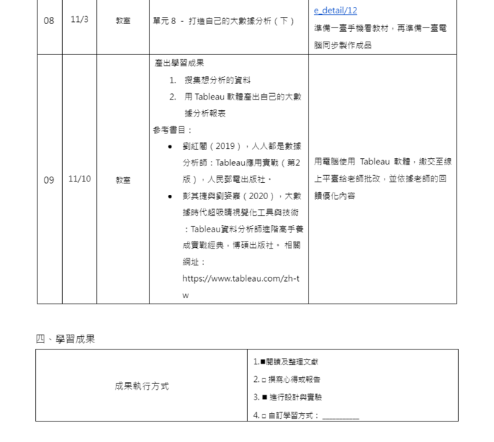 4.課程結束前安排學習任務,幫助學生將本課程所學應用產出學習成果,檢視學習效果並豐富學習歷程。