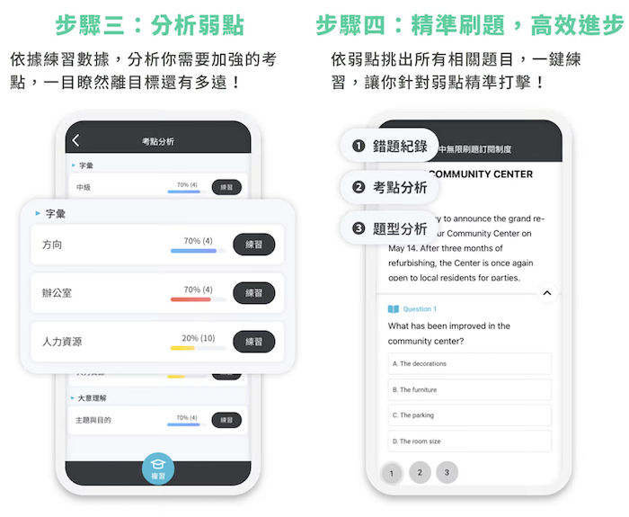 3. 學習成效分析 - 快速反饋 x 題型熟練分析,在練習完成後提供成效分析,以及過往做題紀錄,讓考生有效針對自己的錯題進行複習,並了解自己的強弱項目。