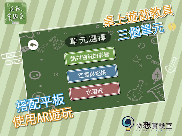 本產品針對國小五年級自然科學實驗單元設計一套桌上遊戲學習教材「搶救實驗室」,共有3個實驗單元,搭配有3種遊戲方式。每一單元的實驗遊戲有可單獨使用圖卡的傳統桌遊教學,也有搭配平板電腦可使用擴增實境(Augmented Reality,簡稱AR)APP(Application)的數位桌遊教學方式,可視教學設備與場域的適性使用。傳統桌遊可供學生在進入實際實驗場域前先了解實驗相關器材、藥品與搭配之實驗反應,而數位桌遊則可運用 AR 呈現模擬的實驗反應,提升學生的學習興趣與建立進入實驗室前的先備知識,兩種教學方式皆可在遊戲式教學中探究思辨與推理能力,並培養學生批判性思考、團隊合作與社交、閱讀理解及激發創意等能力。