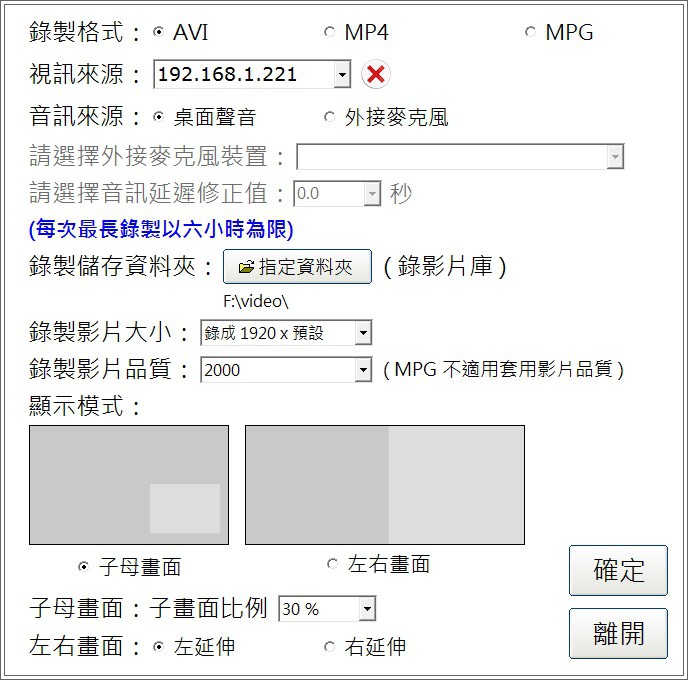 可選擇模式為:1.子母畫面 2.桌面畫面.全景錄製.