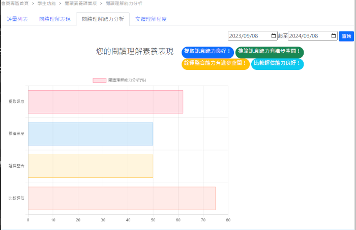 3.精準的評量分析:以數字及圖表分析答題表現及閱讀理解各層次能力,提供適性的素養強化目標。 。
