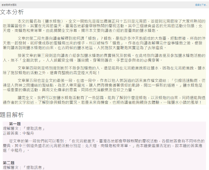 2.詳盡的題目解析:即時回饋答案,並提供精闢的文本分析及詳細的題目解析,引導學生探索問題、省思所答。