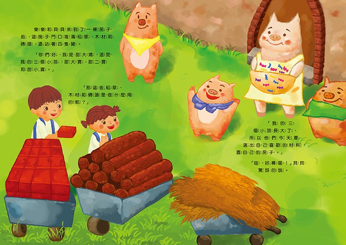 「樂樂貝貝的異想世界」系列書目:《國王的新衣》、《白鶴報恩》、《老鼠與鄉下老鼠》、《三隻小豬》、《誰該騎爐子》、《樵夫的願望》、《龜兔賽跑》、《獅子與老鼠》、《烏鴉的彩色羽毛》、《國王的金手指》、《精靈與鞋匠》、《蟀與螞蟻》這些耳熟能詳的經典童話,蘊含人生智慧,以及對現實的諷喻,也能擴展學生的想像和見識空間,並且培養正確價值觀。