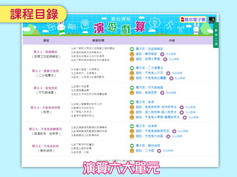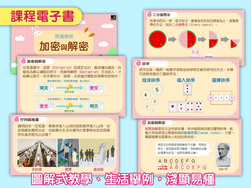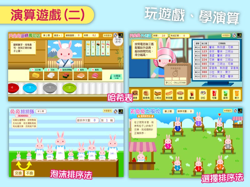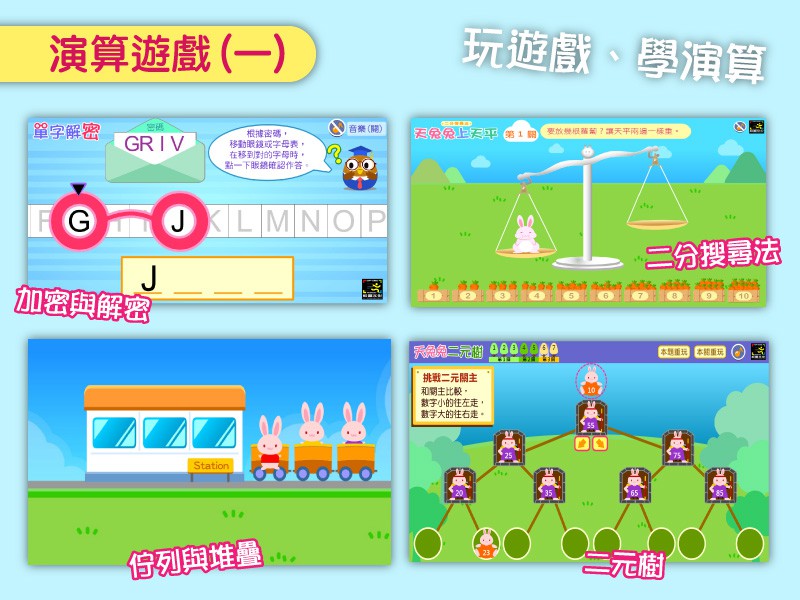 從生活事物中,以遊戲扮演的方式讓學生輕鬆體驗演算法則,增強學生演算法之經驗值,沒有學術式的理論教學,讓學生無痛領略演算法,趣味活潑的遊戲搭配淺易懂的教學,大人小孩玩一遍,演算學習無夢魘!