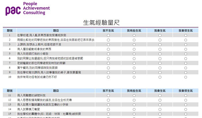 ● 本測驗以學校情境為主,分為生氣經驗、生氣認知及生氣因應三個層面來檢視