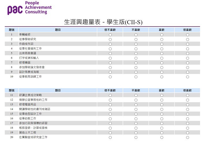 1. 快速找出受測者主要的生涯興趣與方向。