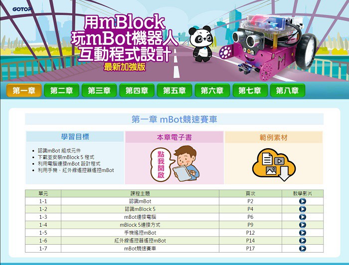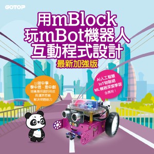 教材以mBlock 5程式積木設計mBot V5.1機器人唱歌跳舞、mBot避開障礙物、mBot循黑線及白線前進、mBot接力賽、人工智慧辨識、mBot播報天氣資訊、機器深度學習辨識鈔票與熊熊123互動遊戲。