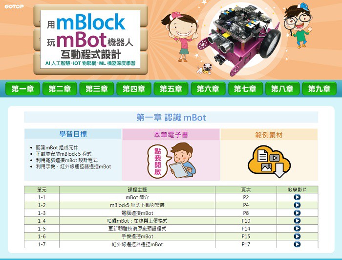 本教材以mBlock 5 (v5.1版)程式積木,帶領學生設計mBot機器人唱歌跳舞、避開障礙物、循黑線及白線前進、接力賽、播報天氣資訊、機器深度學習辨識鈔票…等互動遊戲。