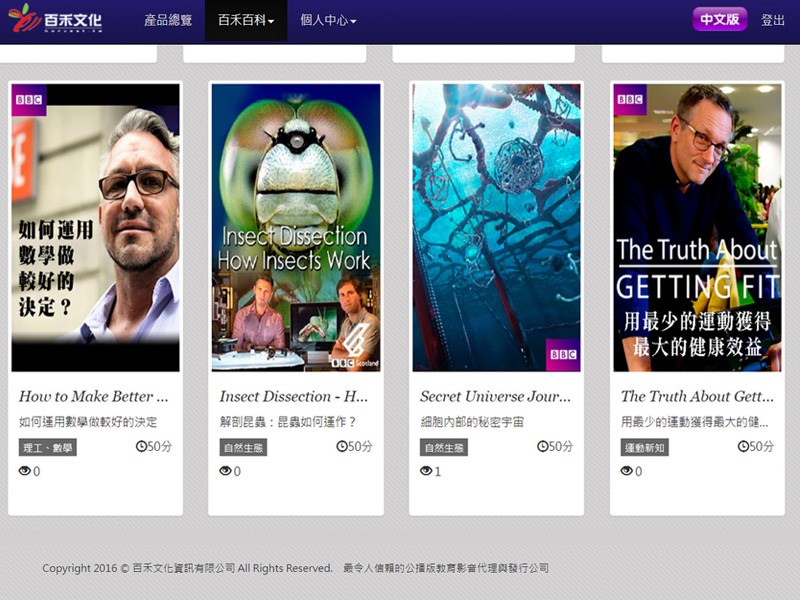 進入本平臺時,只要使用帳號密碼,就可在任何地點順暢地觀看串流影片。請在首頁輸入由百禾為您設定的帳號密碼之後,選取百禾百科入口進入。影片內頁的全螢幕功能適合課堂內播放。為強化影音教育的機能,平臺特別設計的影片播放頁面內附帶中文全字幕內容,方便使用者直接用文字搜尋的方式,找到理想中的影片段落。