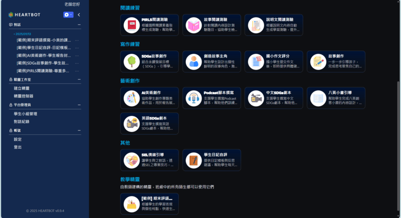 精靈團平臺結合無需程式設計 (no-code) 的特性,教師和學生無需具備技術背景,即可用自然語言輕鬆上手,或使用內建的提示嚮導,有效應用多種最新的生成式AI教育助理,達成教學與學習的目的。