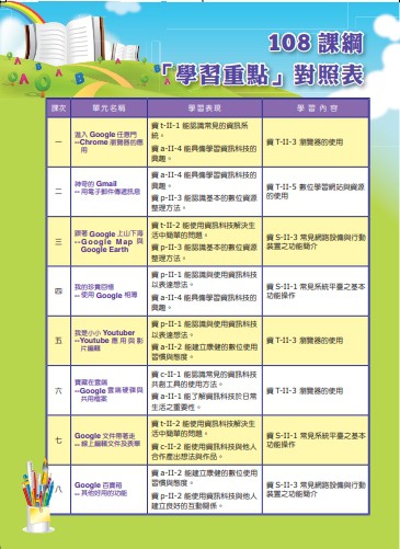 為了增加本內容的實用性,範例的設計以學校課程常用到的,或生活最實 用的內容為主,期望能貼近學生的使用需求,並盡量選取最常使用、或最關鍵的 功能加以介紹,期望學生在使用完本教材之後,能將 Google 所提供的功能,靈 活應用在自己的日常生活中。