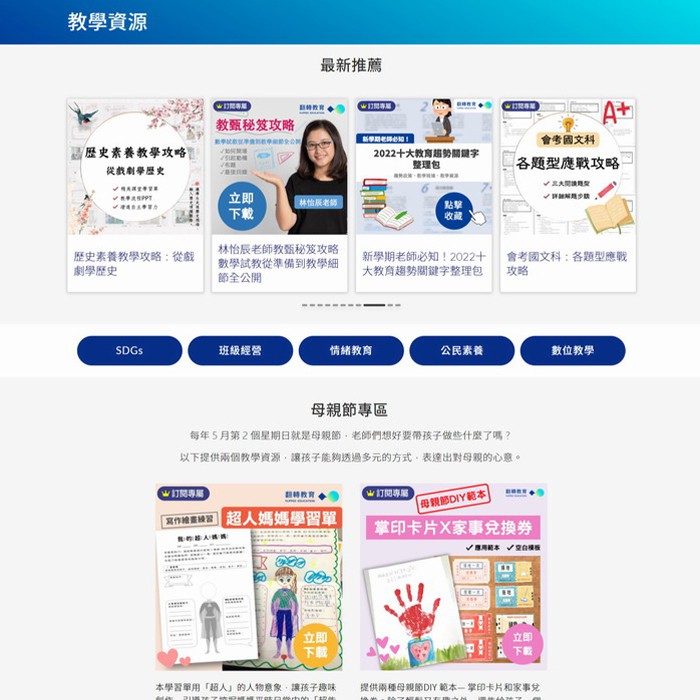 每月提供主題式教學資源,針對課堂教材、實用工具、班級經營三大類提供教學資源,做為教育工作者最實用的創新教學百寶箱。