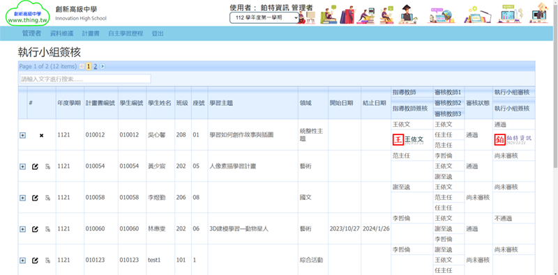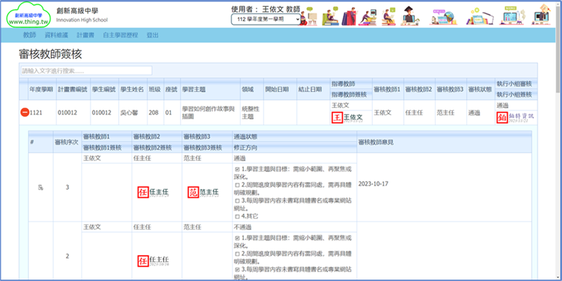 系統使用者分為學生、學生家長、指導教師、審核教師及系統管理者。系統提供個別的入口,提供更完善的登入管理及角色分明。