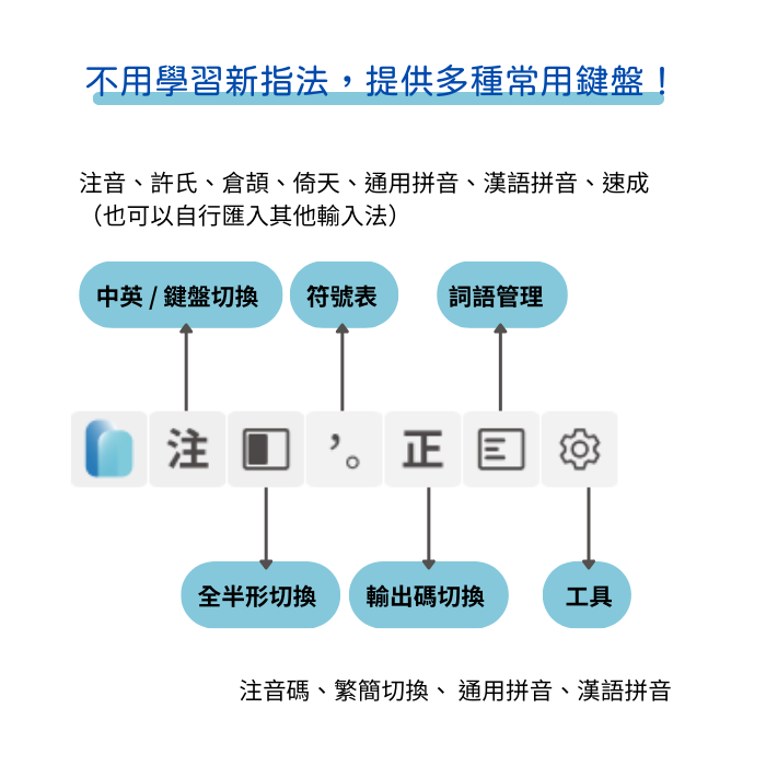 ② 支援注音、許氏、倉頡、拼音等常用鍵盤