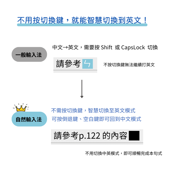 NEW!⑦ 智慧中英切換:不用按切換鍵,自動切換英文模式