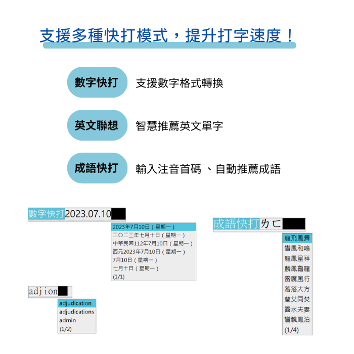 3. 多種快打模式:文字範本、長句聯想、英文聯想、數字快打等,有效提升打字速度及正確率。