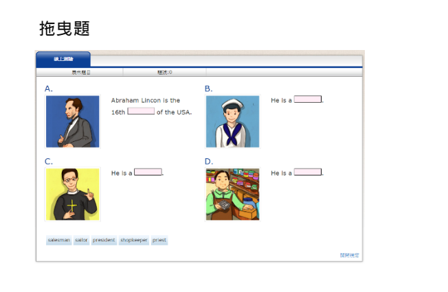 (三)試題類型:選擇題(選擇正確圖片、詞彙)、翻譯題、拖曳題。