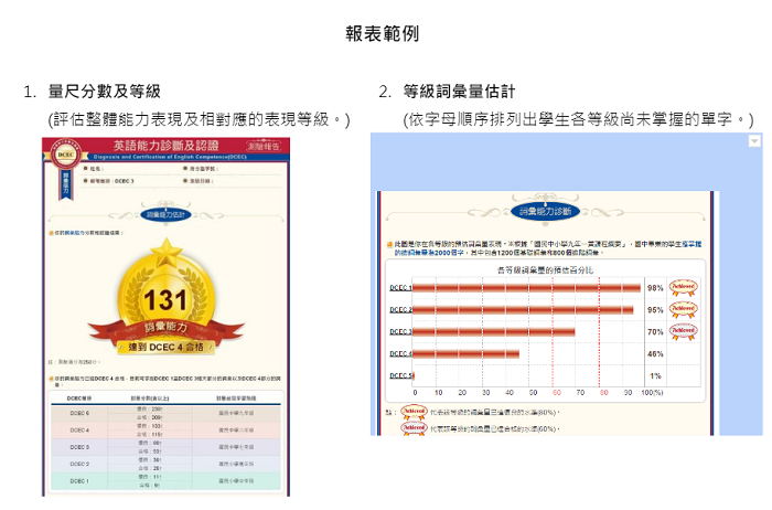 (二)測驗等級說明:測驗等級由從DCEC1到DCEC5(國小中年段至國中九年級),等級越高代表學生能力越高。