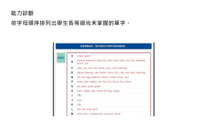 3. 能力診斷:提供三種不同熟稔程度的詞彙表,分別為「得心應手」、「漸入佳境」及「指日可待」。