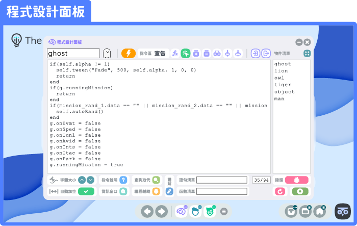 切換按鈕、代碼輸入時的字體調整、指令說明輔助、查找取代按鈕、語句