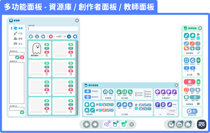 教師面板由畫面下方中央的綠色按鈕,此面板為教學或是講述課程、作品