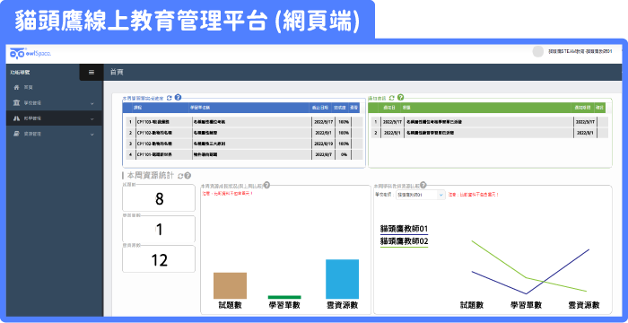 教師於首頁可察看個人使用的試題數量、組合試題成學習單的數量、上傳資