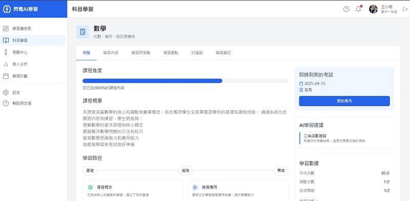 閃電AI學習統籌總指揮是一套全面整合各學科的智能學習管理系統,專為臺灣國高中學生設計,旨在提供一站式的學習解決方案,幫助學生高效備戰小考、段考、會考和學測等各類考試。本系統運用先進的人工智慧、大數據分析和學習科學理論,為每位學生打造個性化的學習體驗。系統的核心功能包括「學習診斷」、「個性化學習路徑」、「跨學科知識整合」和「學習數據分析」四大模塊。「學習診斷」模塊通過智能評估工具,全面分析學生在各學科的知識掌握情況、學習風格和能力特點,為個性化學習提供基礎;「個性化學習路徑」模塊根據診斷結果,為學生量身定制最適合的學習內容、進度和方法,最大化學習效率;「跨學科知識整合」模塊打破學科界限,幫助學生建立知識間的連接,形成系統性的知識網絡;「學習數據分析」模塊則實時追蹤學生的學習行為和成果,提供詳細的進度報告和改進建議。此外,系統還整合了各學科的專業學習模塊,學生可以根據需要無縫切換不同學科的學習。通過這套智能而全面的學習系統,學生能夠實現高效學習,全面提升各學科能力,在各類考試中取得優異成績。