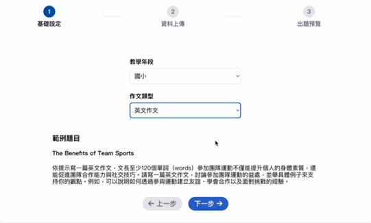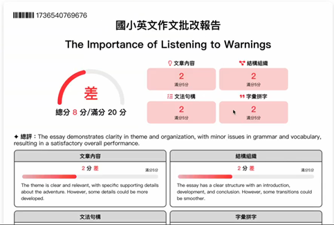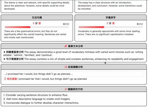 自動寫作輔導:學生提交寫作內容後,系統提供即時的結構建議、語法修正及內容完善指導。
