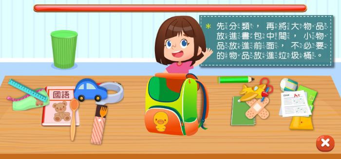 (1)我會整理書包:你會整理書包嗎?把各種上學用品,先拖曳分類好,再將大物品放進書包中間,小物品放書包前面,不必要的物品放進垃圾桶!