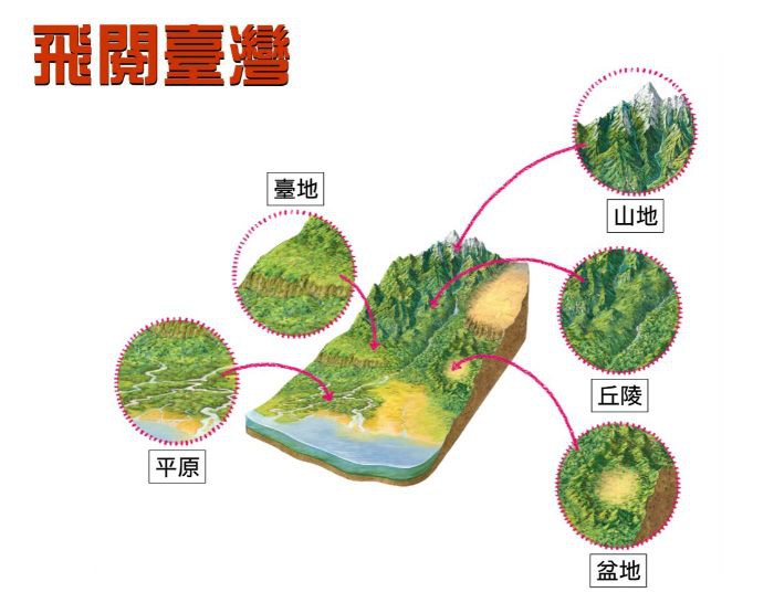 (5)飛閱臺灣:針對臺灣常見的五大地形:平原、臺地、山地、丘陵、盆地