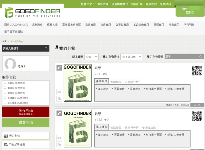 GOGOFINDER「一個帳號三個步驟五分鐘」用戶可以快速建製電子型錄,並可添加文字、圖片、聲音、影片、地圖、連結等多媒體物件,讓教材內容更豐富。透過刊物直線式的閱讀模式,老師們能夠更有效的將資訊傳遞給學生。除此之外,並提供線上閱覽及管控,能隨時更新修改,自動發布更新雲端書櫃,並透過社群分享,達到數位典藏及單位行銷之目的。