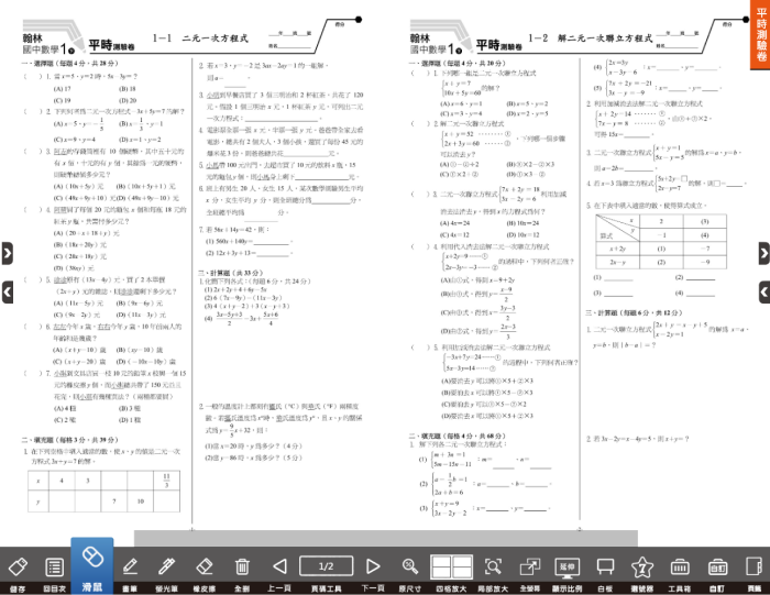 2. 頁面下方可彈性運用操作工具列,有電子閱讀所需各式工具(滑鼠、畫筆、螢光筆、橡皮擦、全刪、四格放大、局部放大、上下頁),還有方便註記或筆記功能(含便利貼、連結、插入文字、插入注釋、可撕貼紙...)等。