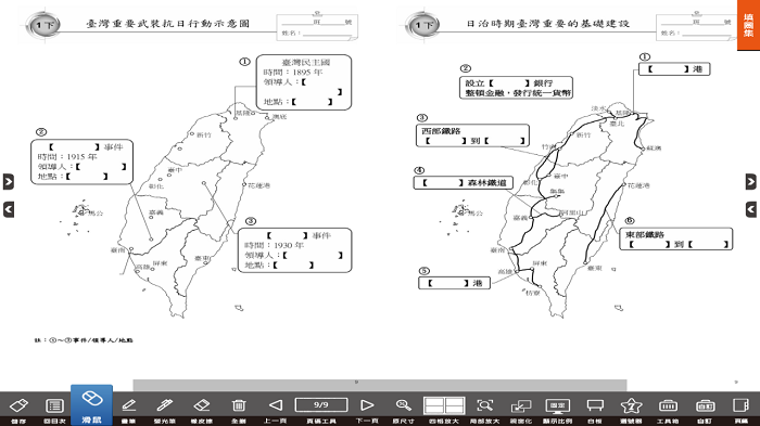 2.頁面下方可彈性運用操作工具列,有電子閱讀所需各式工具(滑鼠、畫筆、螢光筆、橡皮擦、全刪、四格放大、局部放大、上下頁),還有方便註記或筆記功能(含便利貼、連結、插入文字、插入注釋、可撕貼紙...)等。