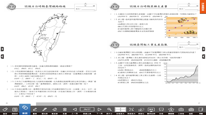 2.頁面下方可彈性運用操作工具列,有電子閱讀所需各式工具(滑鼠、畫筆、螢光筆、橡皮擦、全刪、四格放大、局部放大、上下頁),還有方便註記或筆記功能(含便利貼、連結、插入文字、插入注釋、可撕貼紙...)等。
