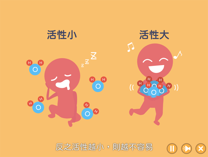 (1)教學:提供影響反應速率的五個因素的概念動畫,讓老師做教學使用,或讓學生在進行遊戲前做複習。