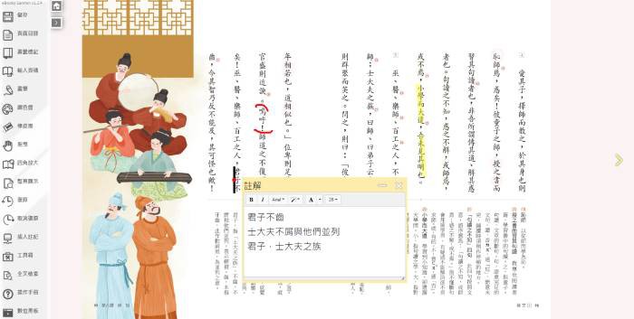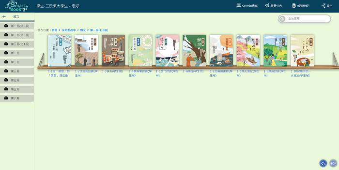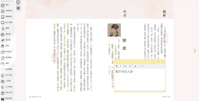 1. 配合三民版普通高中國文實體課本內容,提供課本頁面和多樣的操作工具(滑鼠、畫筆、橡皮擦、書籤、調色盤、局部放大、翻頁、文字便利貼、畫線註記、超連結、插入檔案、全文檢索等)