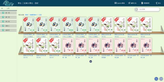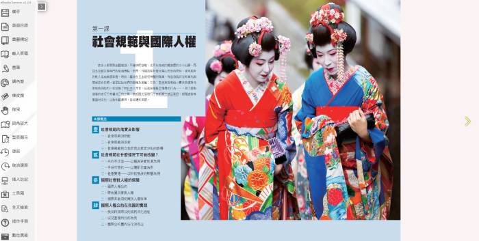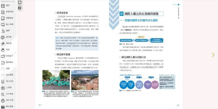 1. 配合三民版普通高中公民實體課本內容,提供課本頁面和多樣的操作工具(滑鼠、畫筆、橡皮擦、書籤、調色盤、局部放大、翻頁、文字便利貼、畫線註記、超連結、插入檔案、全文檢索等)
