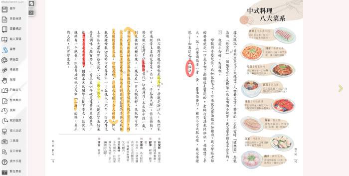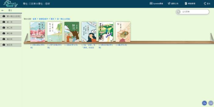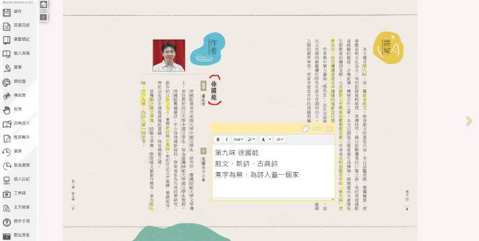 1. 配合三民版普通高中國文實體課本內容,提供課本頁面和多樣的操作工具(滑鼠、畫筆、橡皮擦、書籤、調色盤、局部放大、翻頁、文字便利貼、畫線註記、超連結、插入檔案、全文檢索等)