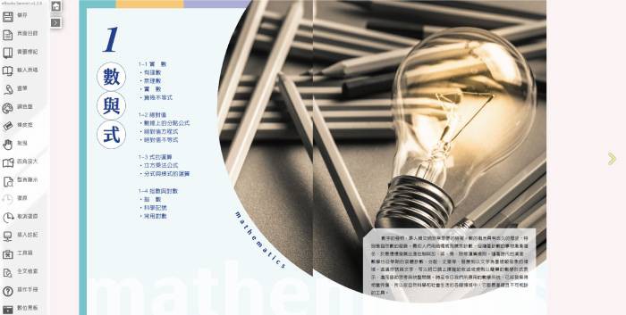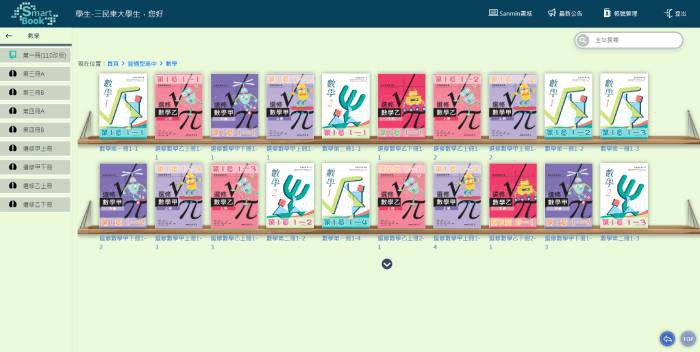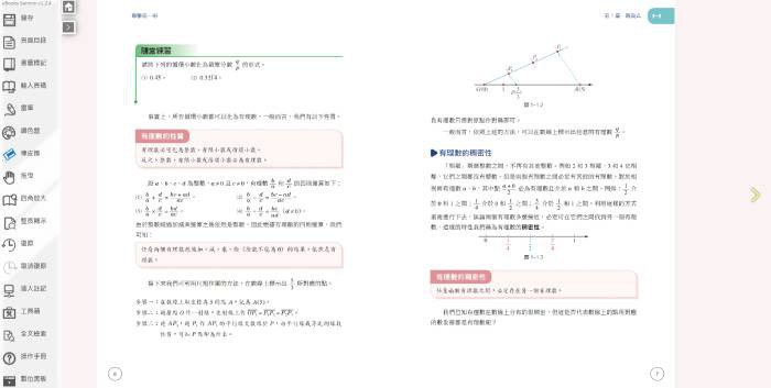 1. 配合三民版普通高中數學實體課本內容,提供課本頁面和多樣的操作工具(滑鼠、畫筆、橡皮擦、書籤、調色盤、局部放大、翻頁、文字便利貼、畫線註記、超連結、插入檔案、全文檢索等)