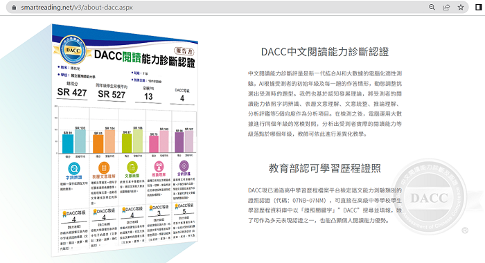 測驗品質的另一項重要檢驗指標,則為測驗分數能否有效反映學習者真正狀態的效度(validity)議題。在此方面DACC同樣以多種方法進行驗證,包含(1)校標關聯效度:取校標與DACC作關聯性預測,包含學習者的國文會考成績及在校國文表現,檢驗結果顯示DACC與學習者的國語文表現有強度的關聯存在;(2)利用現代測驗理論進行分析,僅保留試題品質優良之試題;(3)質性方面則藉由嚴謹的試題審查制度進行反覆修審,再經由多位學科教師及教授進行綜合性評估。以上檢驗結果皆顯示DACC具有極佳的品質,能測量到學生真實的閱讀能力表現。