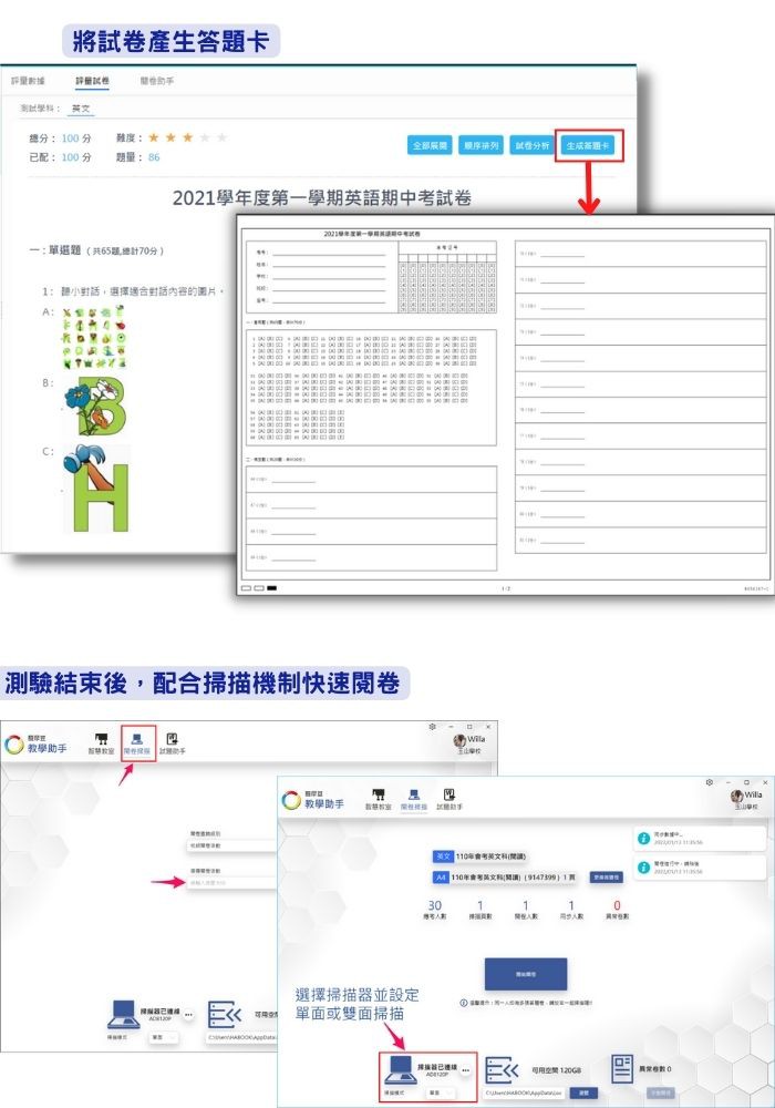 這套自動網路閱卷系統,能夠將LMS平臺上的試卷產出卷卡合一的答題卡,列印之後即可讓學生進行測驗活動。考完試,收齊答題卡,以高速掃描器進行掃描,選擇題、是非題等客觀題自動批閱,填充題、問答題、作文等主觀題型,則由教師透過雲端平臺評閱、給分,最後總結成績報告。