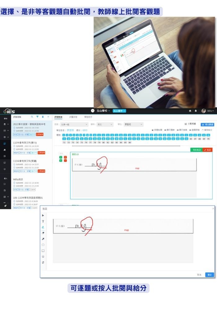掃描工作完成後,選擇題、複選題、是非題等客觀題,系統就已經自動批閱給分完成,若測驗題目有包含填充、問答、計算、作文等主觀題型,則由相關教師在平臺上線上評閱。